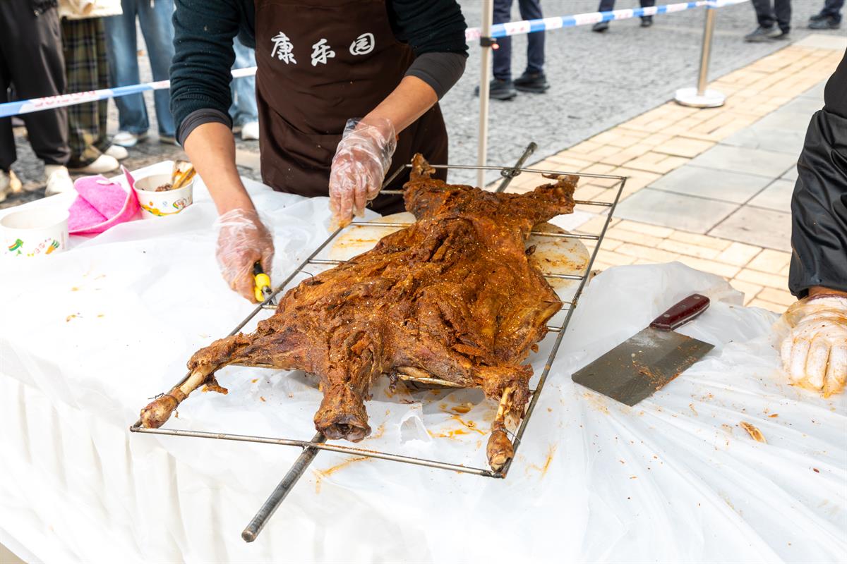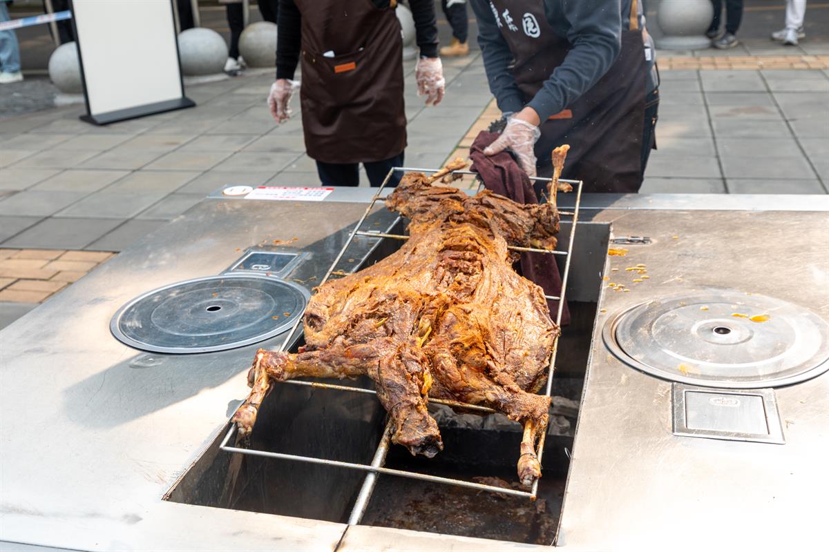 “烤全羊”作为本次参展的“明星暖冬单品”,一登场便凭借浓郁的香气俘获了众多师生的目光。精选优质羔羊,经过多道工序腌制入味,再以慢火悉心烤制。表皮金黄酥脆,轻轻一咬便能听到“咔嚓”的声响,内里的肉质却鲜嫩多汁,每一丝纤维都吸饱了秘制香料的精华,咸香醇厚的口感在舌尖层层绽放,一口下去暖意十足,让人回味无穷。